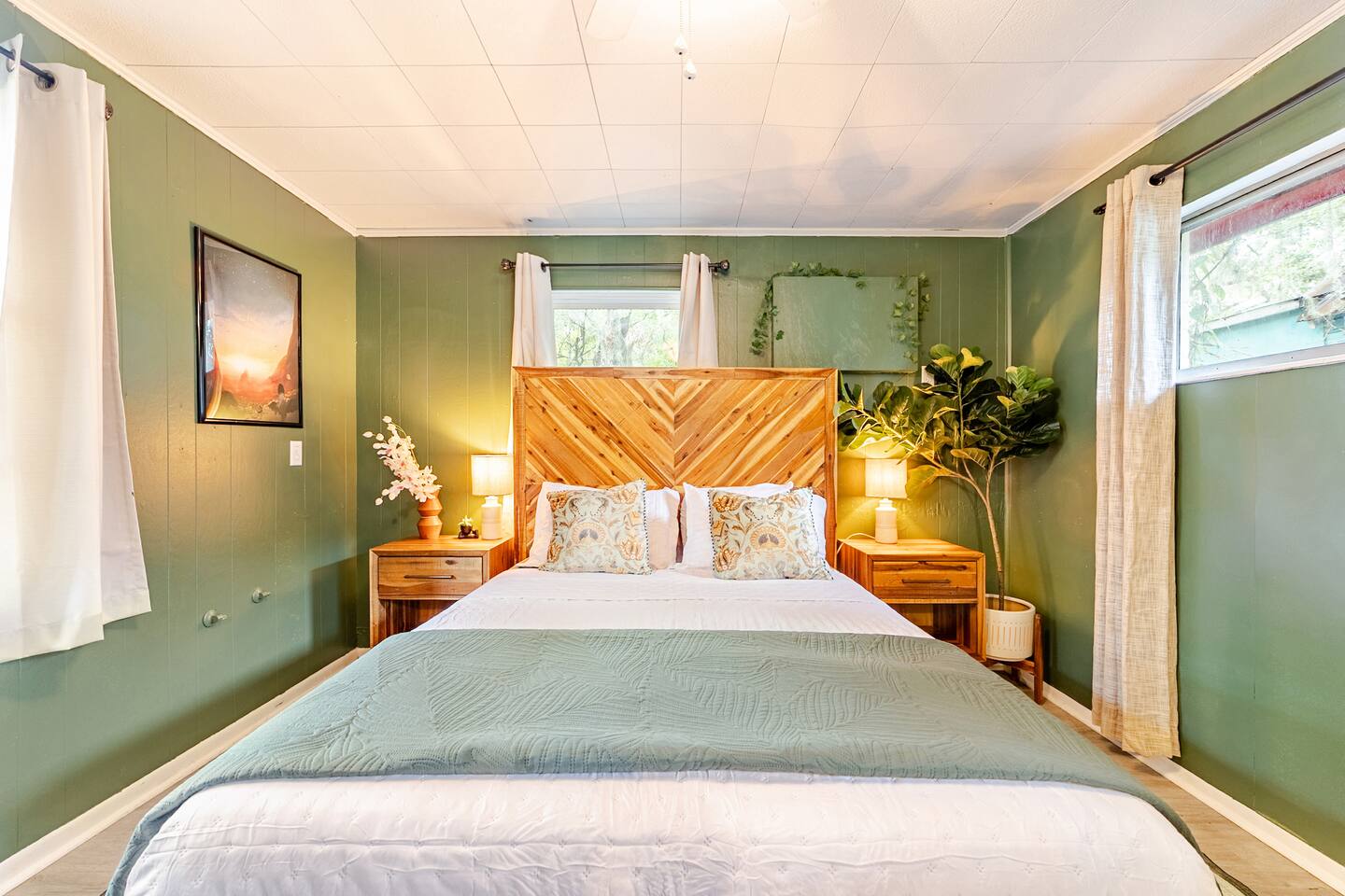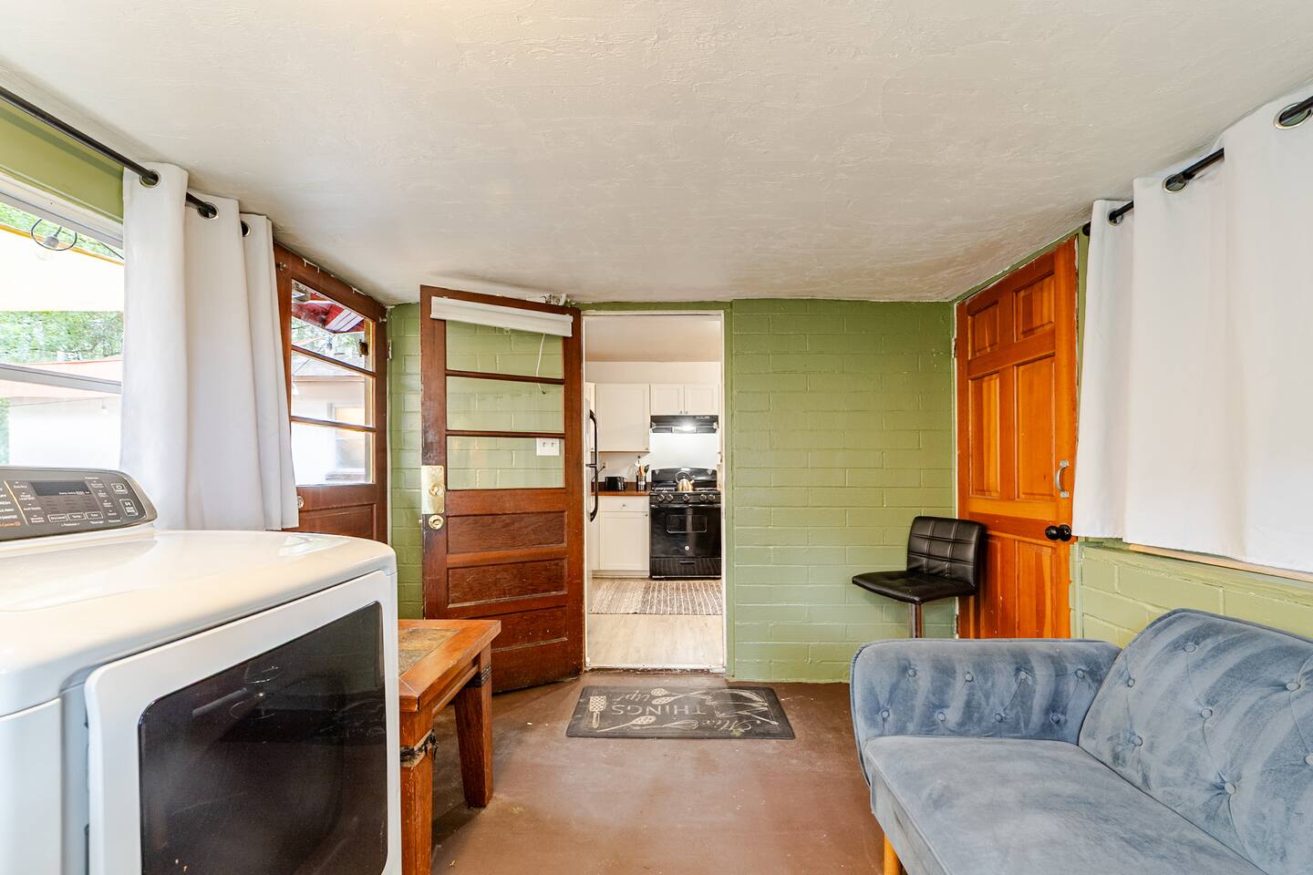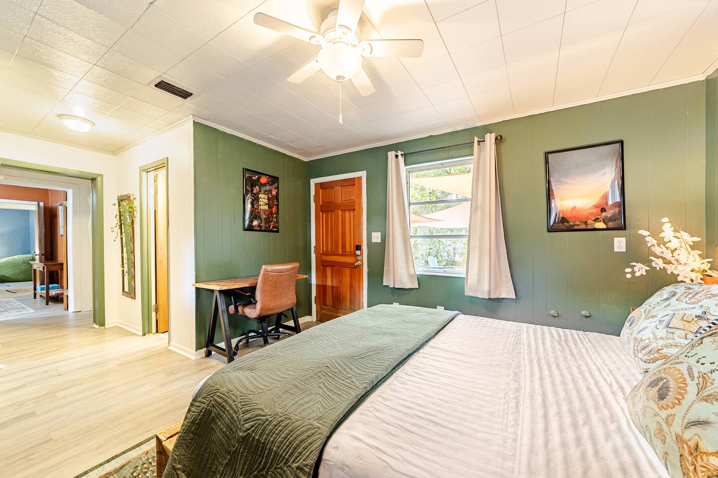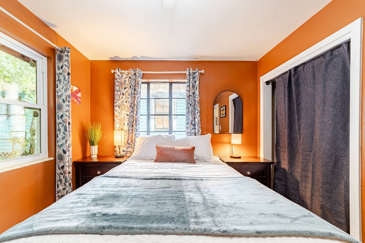 To reach the master suite, you’ll either walk through the red/orange bedroom or use its private backyard entrance. The green room includes a futon for extra sleeping space and also has the laundry area.