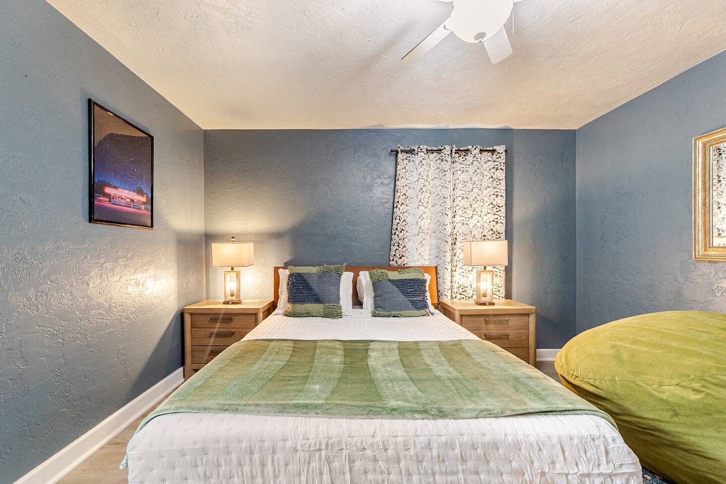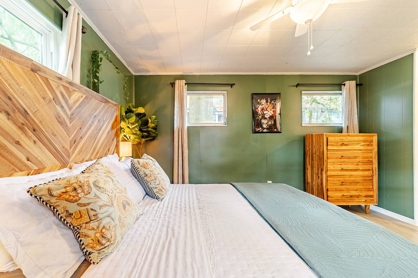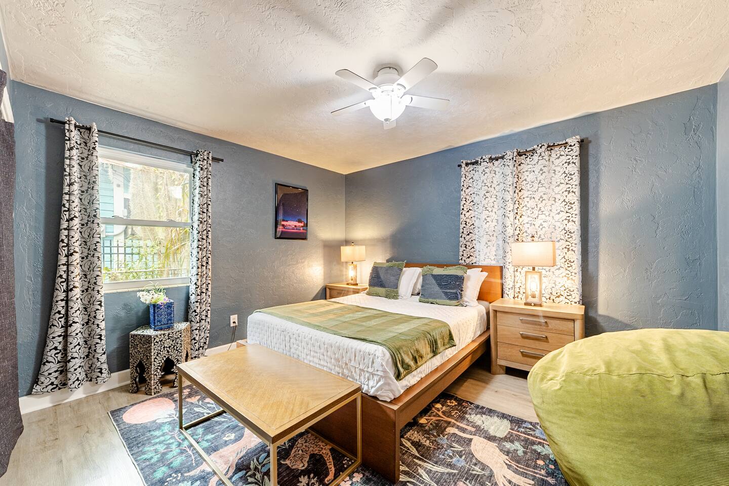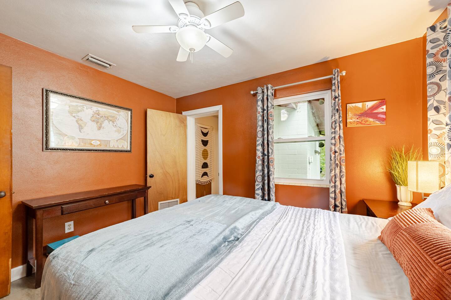To reach the master suite, you’ll either walk through the red/orange bedroom or use its private backyard entrance. The green room includes a futon for extra sleeping space and also has the laundry area.