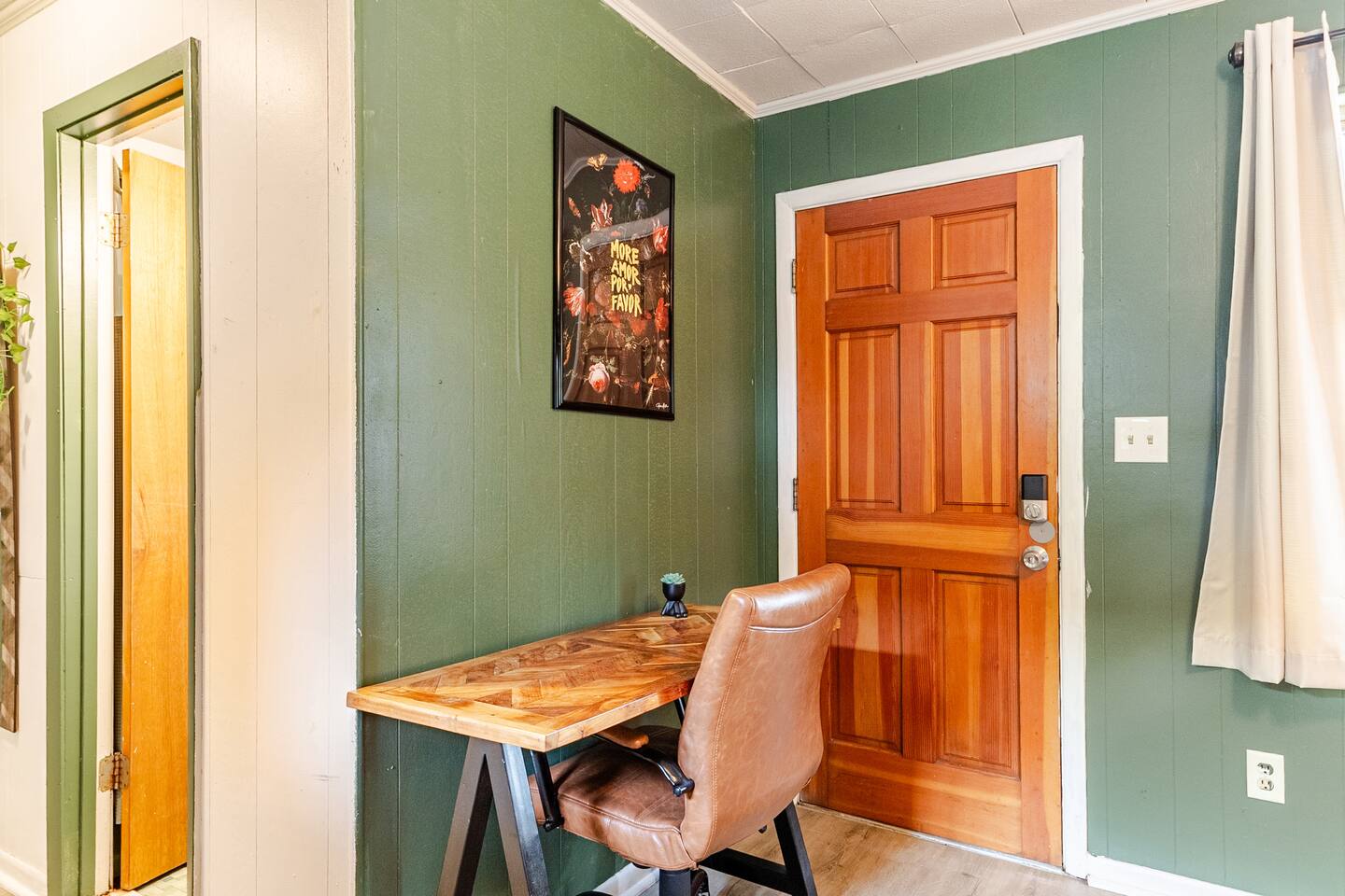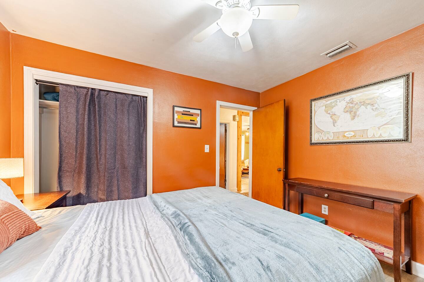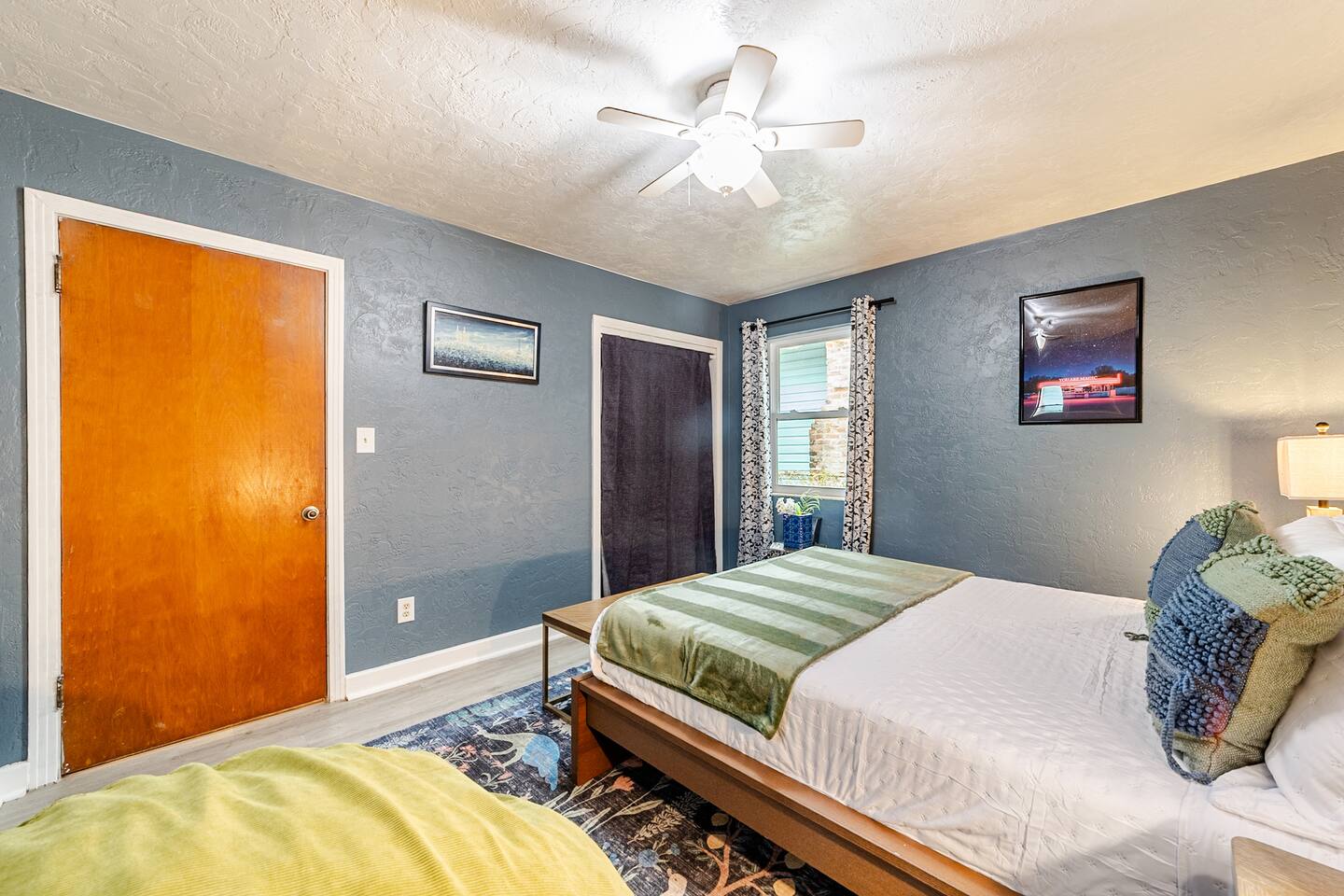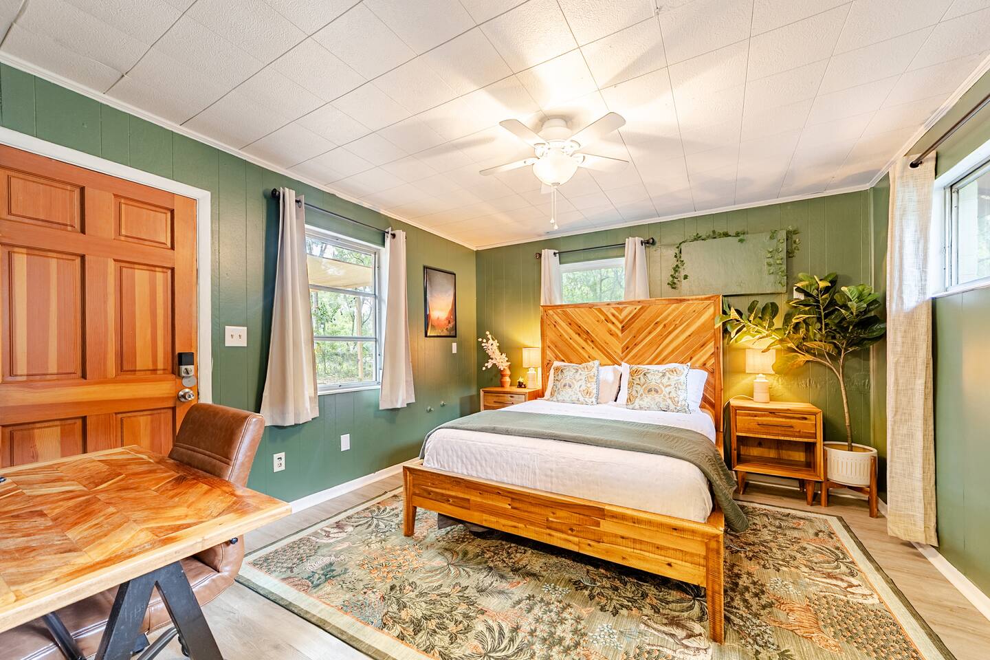 To reach the master suite, you’ll either walk through the red/orange bedroom or use its private backyard entrance. The green room includes a futon for extra sleeping space and also has the laundry area.
