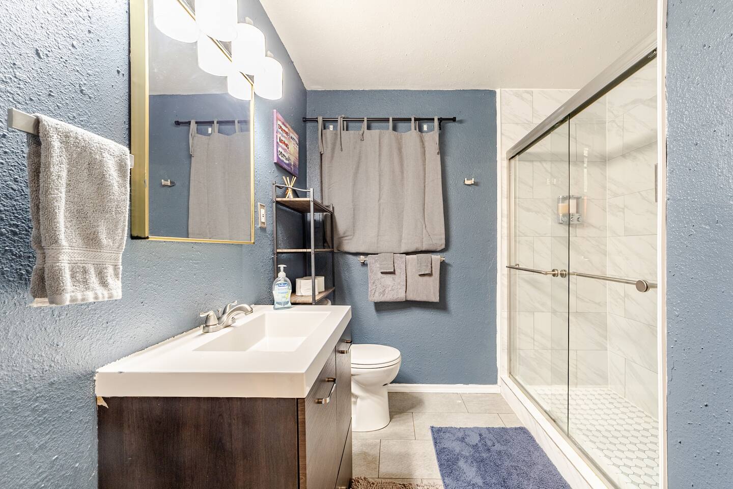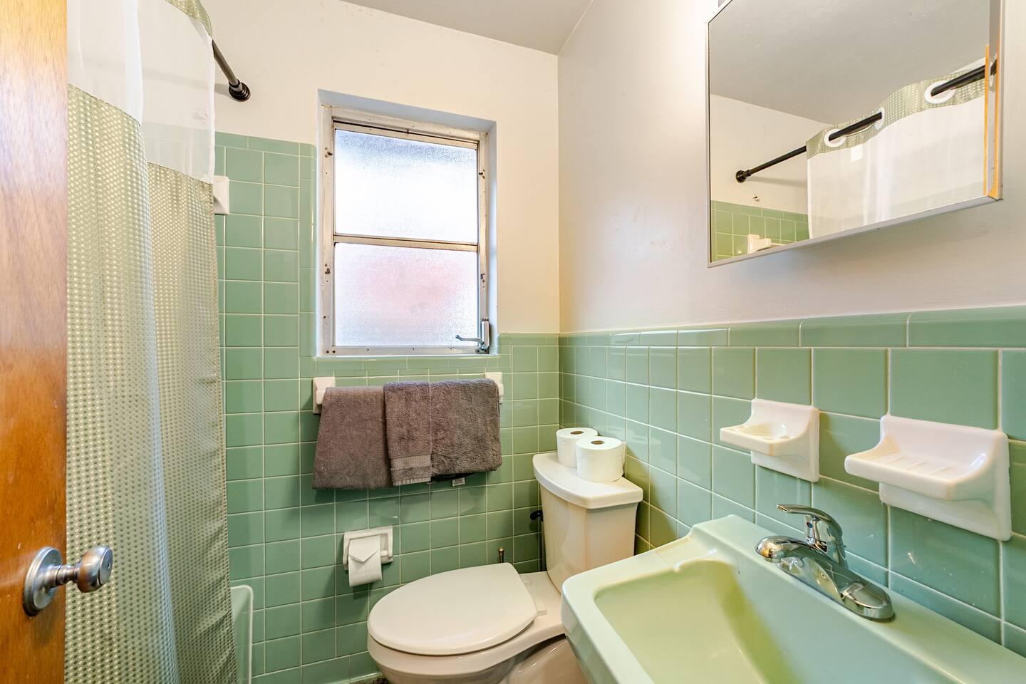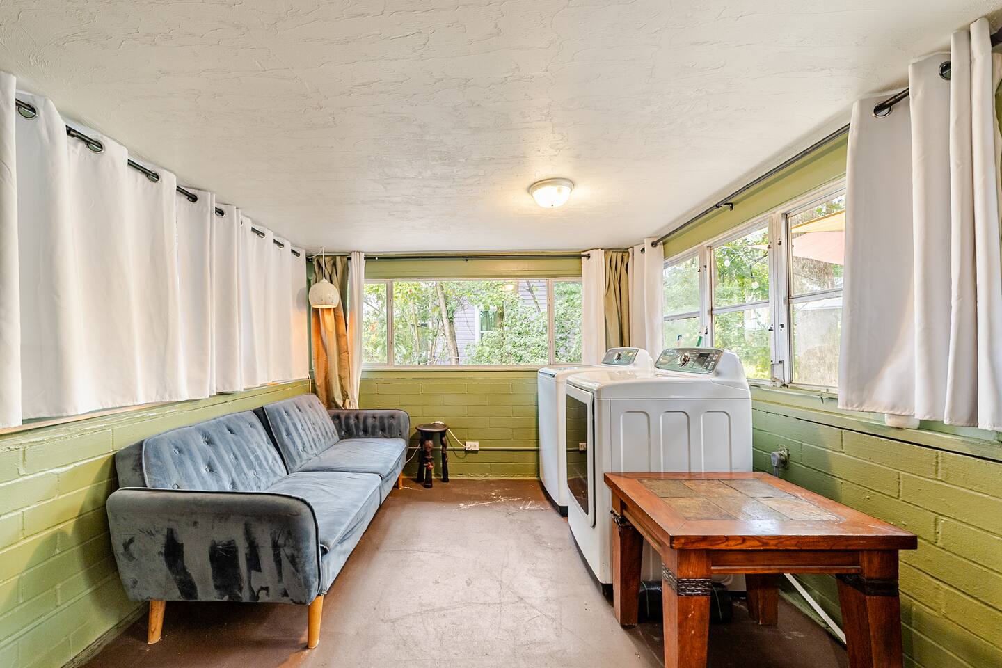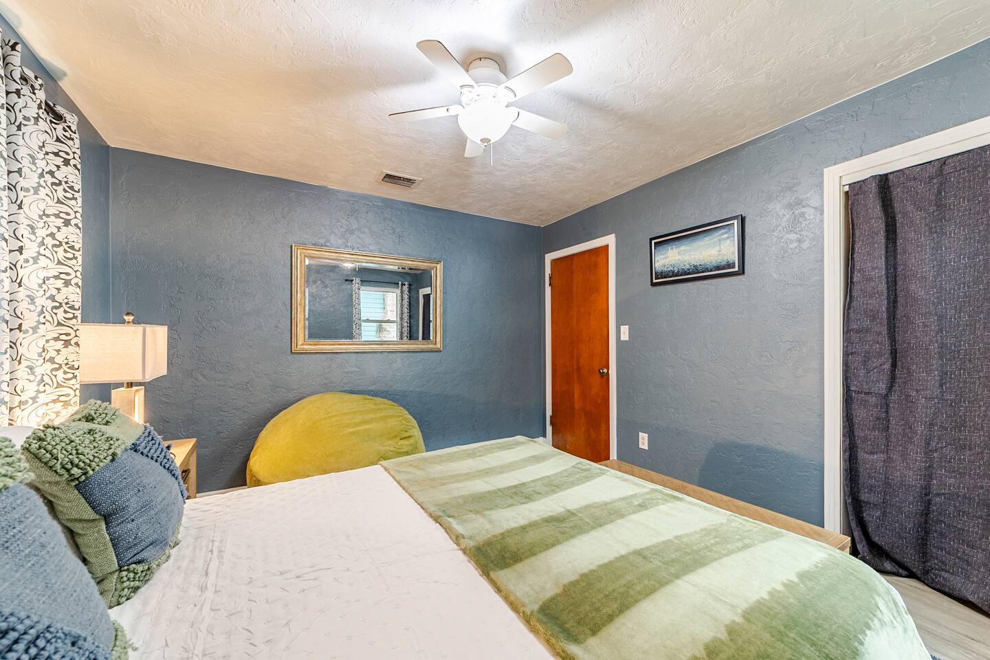 To reach the master suite, you’ll either walk through the red/orange bedroom or use its private backyard entrance. The green room includes a futon for extra sleeping space and also has the laundry area.