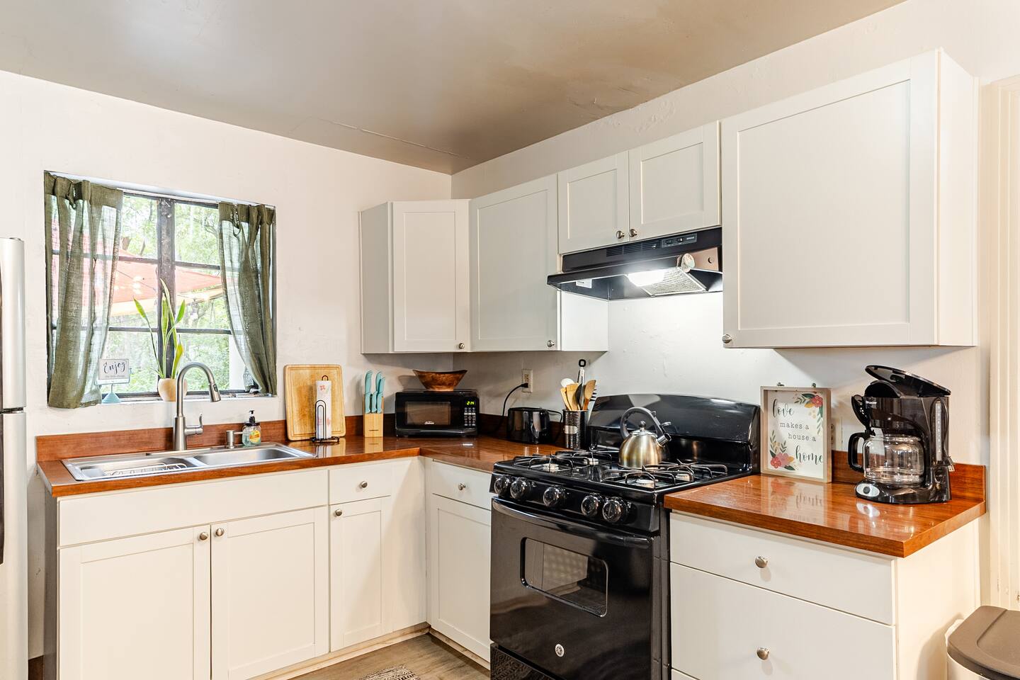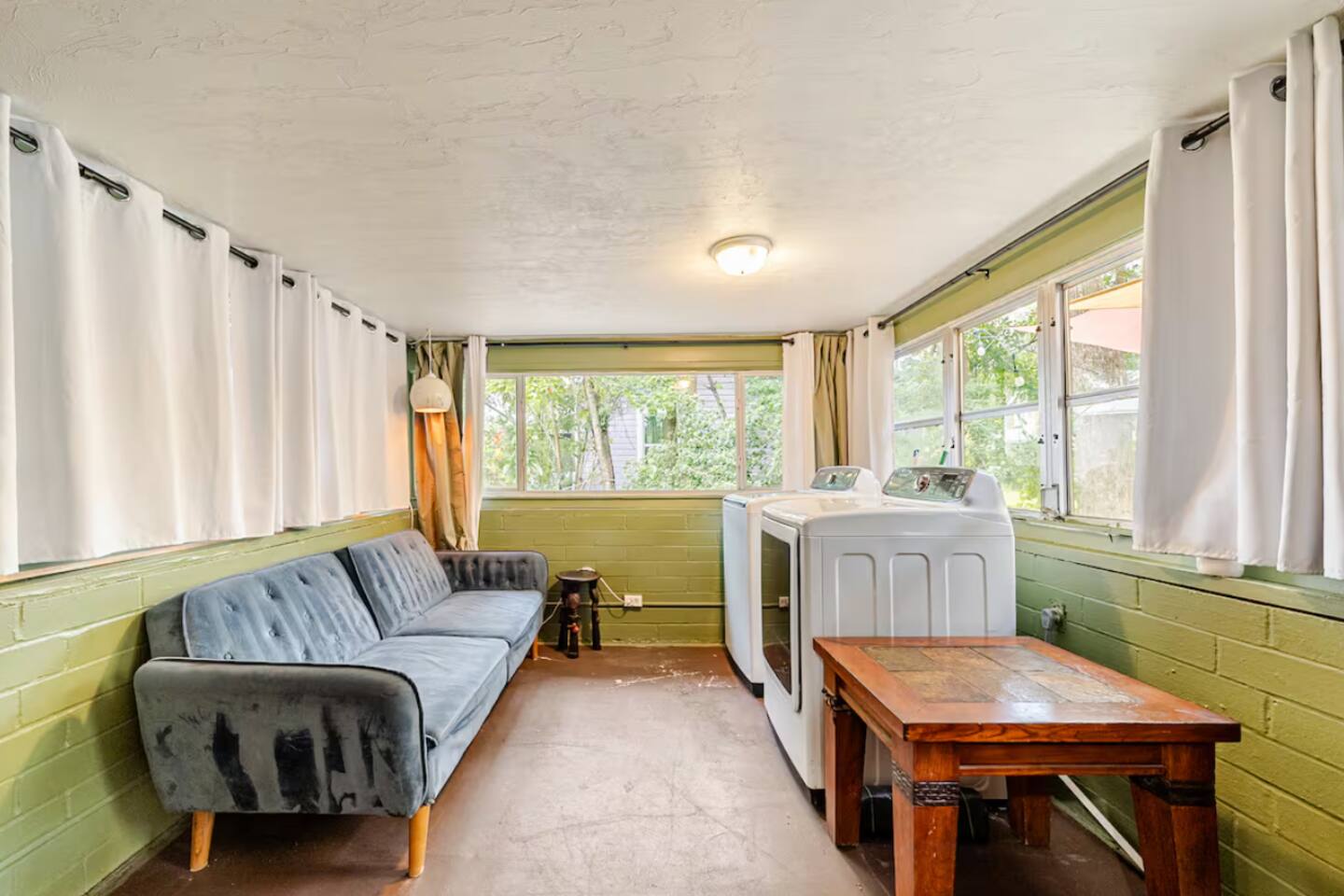 Bedroom Layout Note 🛏️ The second bedroom (the red/orange room) sits between the main house and the master suite. To reach the master, you’ll either walk through this room or enter via its private backyard entrance. The green room has a futon for extra sleeping space and also houses the laundry area for guest use. Outdoor Space 🌿 Step into a peaceful backyard oasis filled with towering trees, lush ferns, and even a resident owl perched high above. The yard is spacious and full of natural charm—perfect for relaxing or gathering. Guests can enjoy the large firepit (bring your own firewood), a Weber charcoal grill (BYO charcoal), and Adirondack chairs tucked beneath the trees.